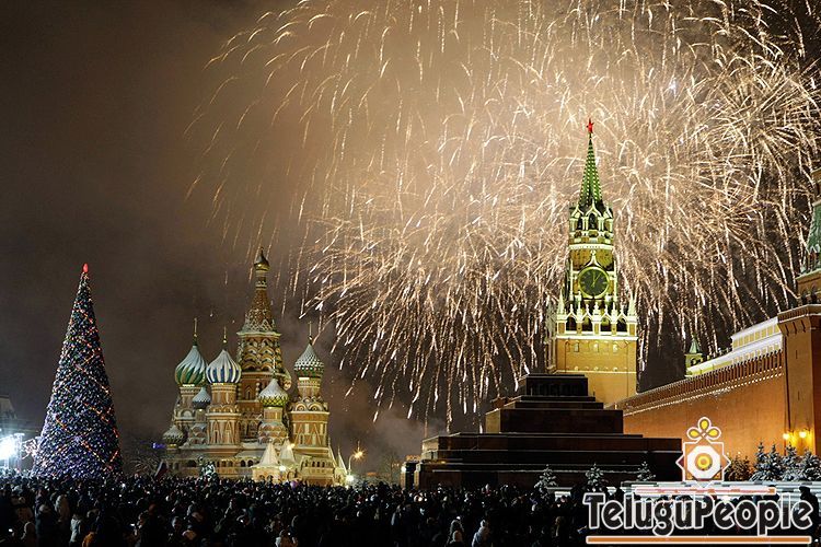 Russians celebrate the New Year on Red Square in Moscow, with the Kremlin in the background, right, and St. Basil's cathedral in background, left, Friday, Jan. 1, 2010. Tens of thousands of people gathered on the Square to celebrate the new year, and view the fireworks as the clock on the Kremlin's Spassky Tower, right, struck midnight. (AP Photo/Mikhail Metzel) #