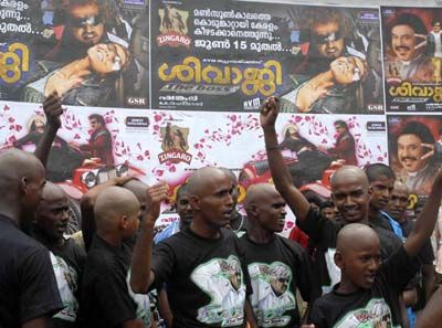 Ecstatic Rajni Kanth fans with tonsured heads rejoicing at a theatre in Kochi on Friday where the superstar s new film Sivaji was released.