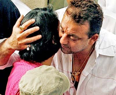 Bollywood actor Sanjay Dutt, centre, hugs his sisters Namrata, right back facing camera, and Priya, centre left, before leaving his residence for the special court trying cases of the 1993 Mumbai bombings that killed 257 people in Mumbai on Tuesday, July 31, 2007. Dutt gets 6-year rigorous imprisonment in the 1993 Mumbai blasts case.