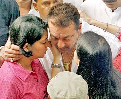 Bollywood actor Sanjay Dutt, centre, hugs his sisters Namrata, right back facing camera, and Priya, centre left, before leaving his residence for the special court trying cases of the 1993 Mumbai bombings that killed 257 people in Mumbai on Tuesday, July 31, 2007. Dutt gets 6-year rigorous imprisonment in the 1993 Mumbai blasts case.