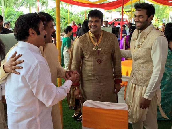 Manchu Manoj groom ceremony is held at their farm house in Shamshabad. Many stars including Chiranjeevi and Bala krishna attended the event.