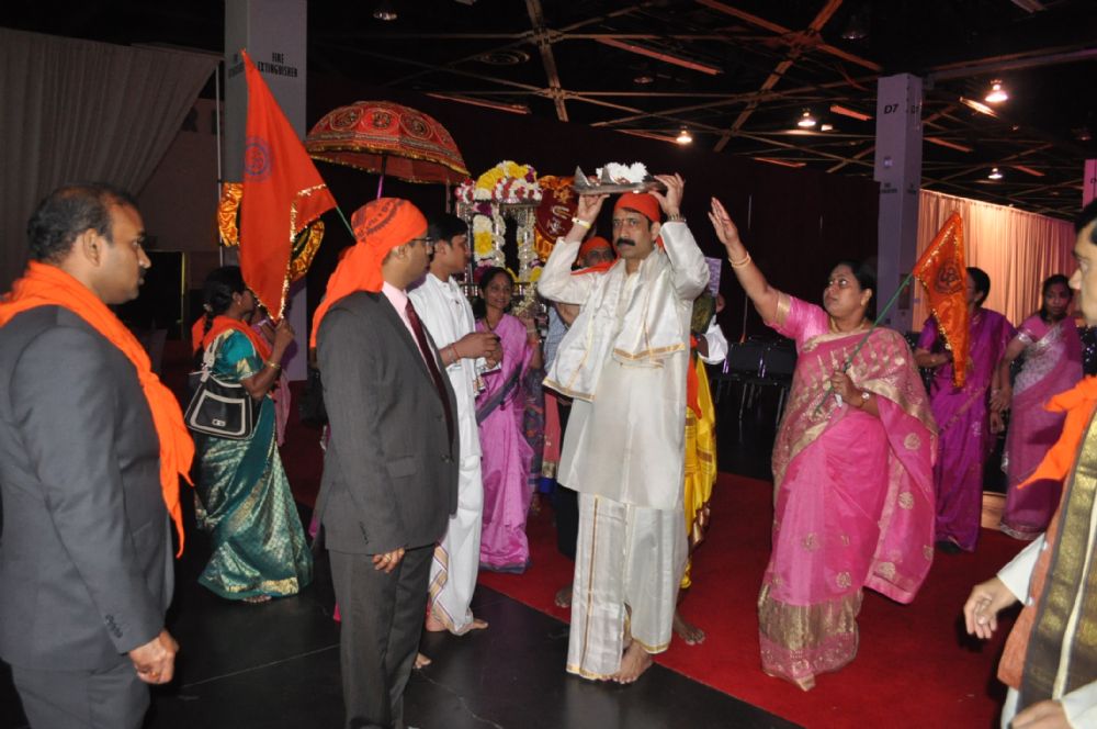NATS 4th Telugu Sambaralu on day two started with the devotional activities in Los Angeles. Actor and MLA Nandamuri Balakrishna, Justice Noothi Ramamohan Rao, Ambika Krishna, Errabelli Dayakararao, actors Ali, Sai Kumar, Kota Sankararao and others participated in Sai baba Palanquin seva.