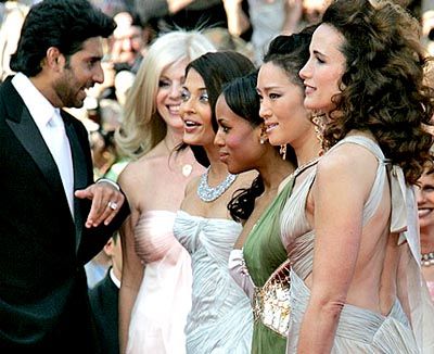 Meet my friends: Abhishek Bachchan (L) looks on as wife Aishwarya poses with fellow L Oreal counterparts -- Kerry Washington, Michelle Yeoh and Andie MacDowell on Wednesday.