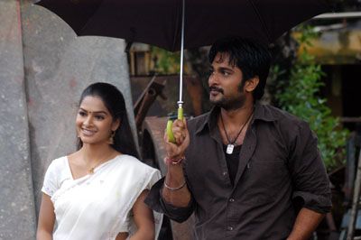Rishi and Madhumita in a working still of a telugu movie Gharjana, produced by G.Blakrishna on Lakshmi Talkies Banner and directed by Udayabhanu.