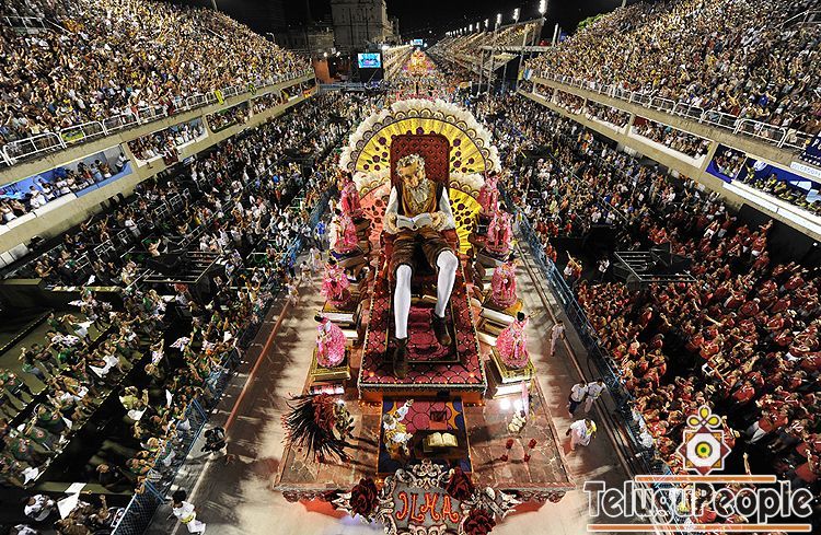Members of the Uniao da Ilha do Governador samba school perform atop their float at the Sambodrome in Brazil on February 14, 2010. (VANDERLEI ALMEIDA/AFP/Getty Images) #