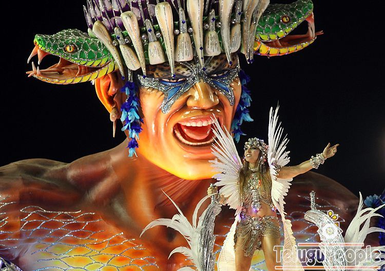 A member of Beija Flor samba school performs on the front of a float during carnival celebrations at the Sambadrome in Rio de Janeiro, early Monday, Feb.15, 2010. (AP Photo/Martin Mejia) #
