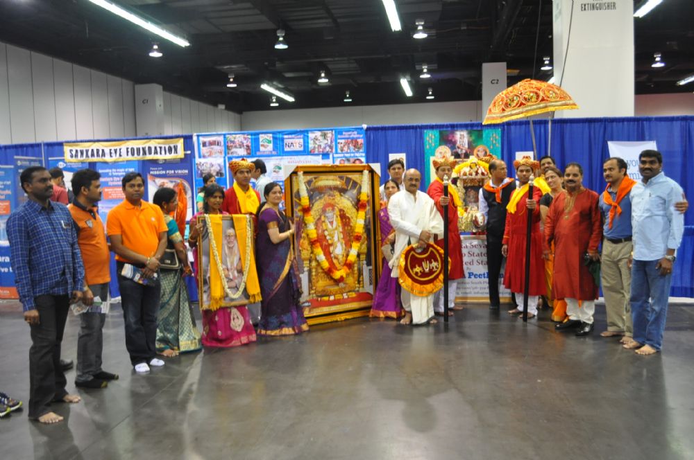 NATS 4th Telugu Sambaralu on day two started with the devotional activities in Los Angeles. Actor and MLA Nandamuri Balakrishna, Justice Noothi Ramamohan Rao, Ambika Krishna, Errabelli Dayakararao, actors Ali, Sai Kumar, Kota Sankararao and others participated in Sai baba Palanquin seva.