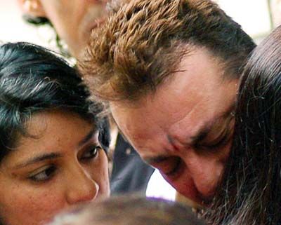 Bollywood star Sanjay Dutt embraces an unidentified person as his sister Priya Dutt (L) looks on at his residence prior to leaving for the 1993 Mumbai blasts trials in Mumbai July 31, 2007.