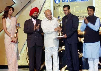 Bollywood star Salman Khan received 10th Rajiv Gandhi awards from Union Minister Shushil Kumar Shinde in Mumbai on Sunday. Shilpa Shetty, Charen Singh Sapra, Vilashrao Deshmukh, Guru Das Kamat are also seen.