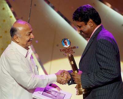 Kapil Dev received 10th Rajiv Gandhi award from Union Minister Shushil Kumar Shinde in Mumbai on Sunday.