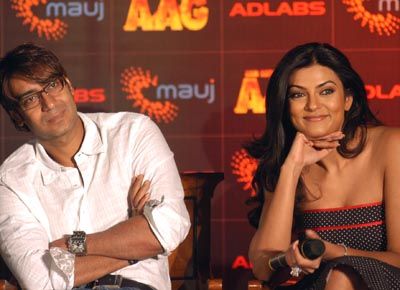 Actors Sushmita Sen and Ajay Devgan at the launch of audio-visual promos and games of film "Ram Gopal Verma Ki Aag" by Mauj in association with Ram Gopal Verma and Adlabs Films in Mumbai on Tuesday night.