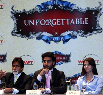 Amitabh Bacchan speaking at a press conference about "his upcoming World tour The Unforgettable, Abhishek Bacchan and Aishwarya Rai can be seen in picture.