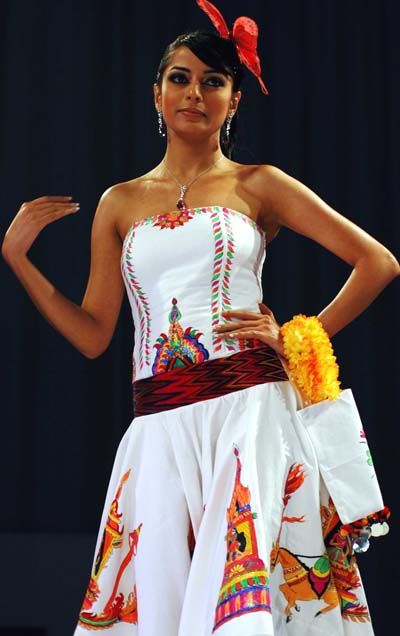 A model displays a creation of Indian designer Anjana