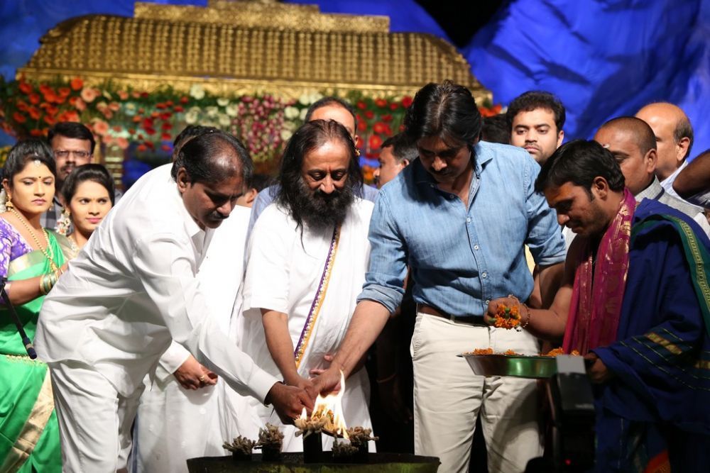 Actor and founder of Janasena party Pawan Kalyan attended as chief guest for koti deepothsavam along with pandit Ravi Shankar and Chaganti Koteswara Rao in Hyderabad.