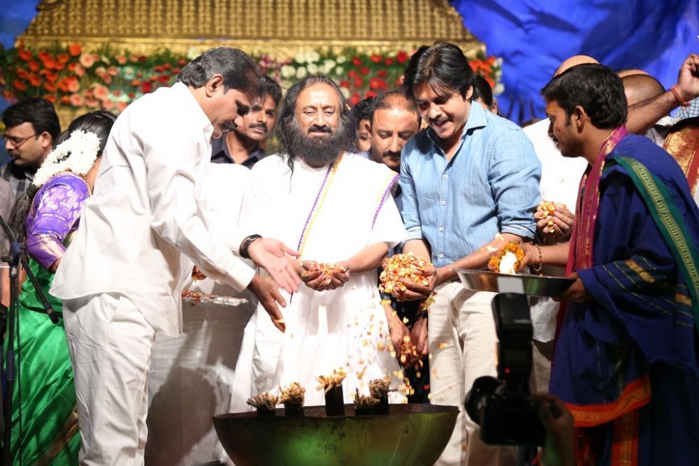 Actor and founder of Janasena party Pawan Kalyan attended as chief guest for koti deepothsavam along with pandit Ravi Shankar and Chaganti Koteswara Rao in Hyderabad.