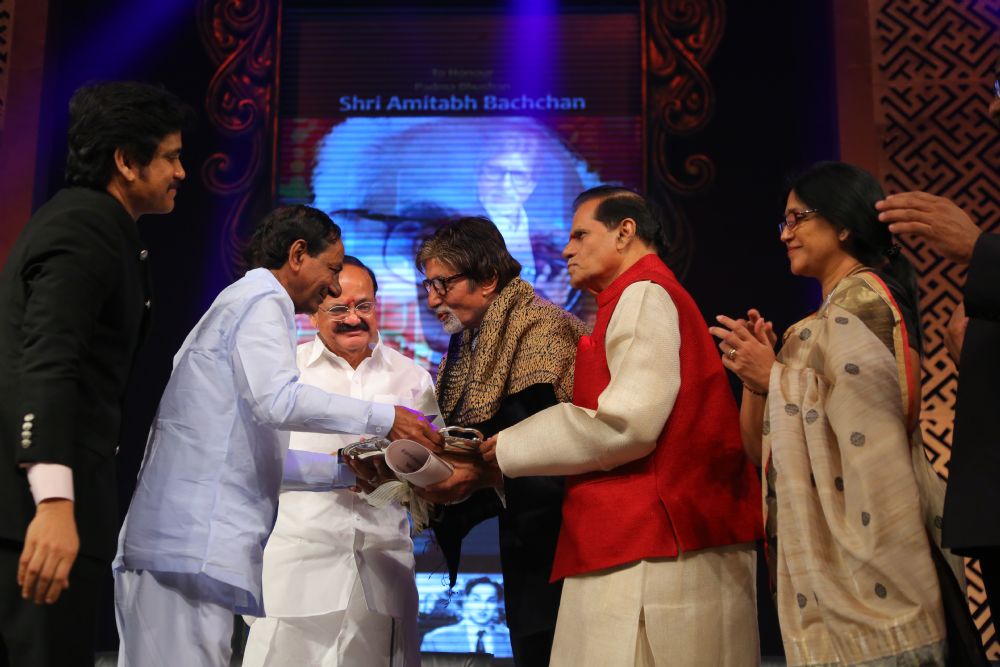 Amitabh Bachchan was presented with the prestigious ANR National award for his decades of dedication to Indian cinema at a glittering ceremony held at the Annapurna Studios in Hyderabad. Chief Minister of Telangana K. Chandrasekhar Rao and Parliamentary Affairs Minister M Venkaiah Naidu graced the occasion and presented the award to Mr.Bachchan. All the top celebrities from tollywood were present at the award ceremony.
