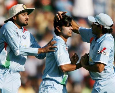 India bowler, R.P.Singh(centre), celebrates taking the wicket of Pakistan batsman, Muhammad Hafeez, for 1 run Pakistan during the ICC Twenty20 World Championship final played at the Wanderers Stadium, Johannesburg, South Africa, 24 September 2007.