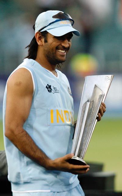 India s captain Mahendra Dhoni holds the ICC World Twenty20 trophy after his team defeated Pakistan in the final cricket match in Johannesburg September 24, 2007.