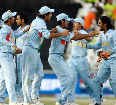 India s players celebrate their victory over Pakistan in the ICC World Twenty20 cricket final match in Johannesburg September 24, 2007.