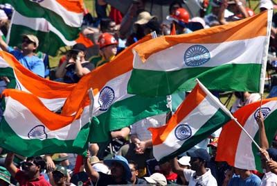 India fans wave their national flags to cheer for their team before the start of the play in the ICC World