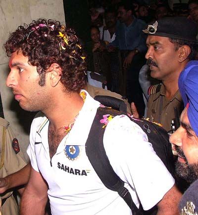 Twenty-20 World Cup winner team member Yuvraj Singh at Chhatrapati Shivaji airport in Mumbai on Wednesday.