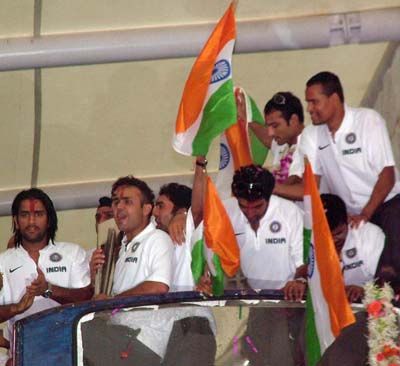 on the arrival of the ICC Twenty- 20 World Cup winner team in Mumbai on Wednesday.