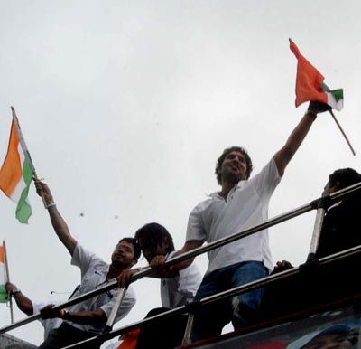 World Cup winner team members cheer during the team s journey from airport to Wankhede stadium during the welcome