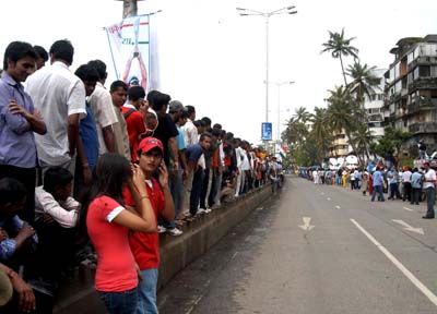 Cricket fans awaiting the arrival of the motorcade carrying the victorious T-20 India cricket team from airport to Wankhede stadium for a welcome ceremony, in Mumbai on Wednesday.