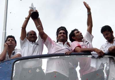 T-20 World Cup winner team members cheering from the top deck of a double-decker bus during the journey from airport to Wankhede stadium in Mumbai on Wednesday.
