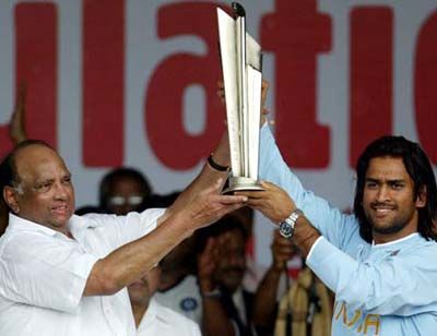 BCCI president Sharad Pawar and Team India skipper Mahendra Singh Dhoni display the Twenty20 World Cup trophy at the celebratory function in Wankhede Stadium, Mumbai.