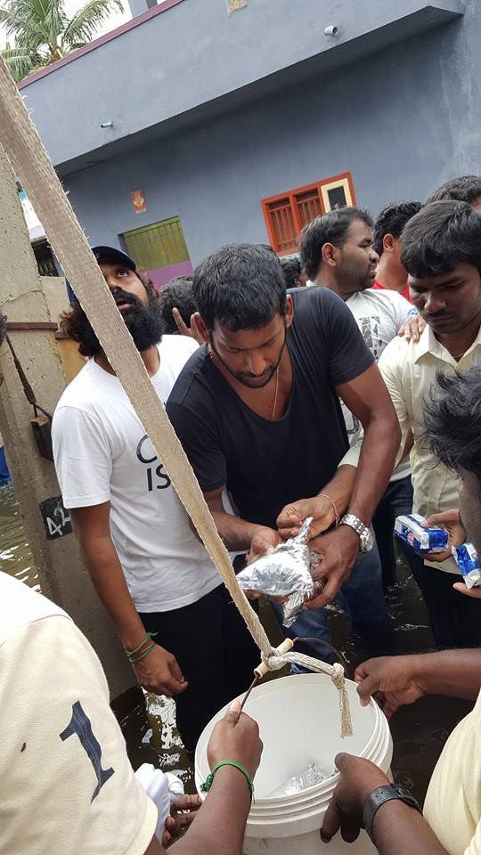 Apart from donating money actor Vishal Krishna participated directly in flood relief activities in Chennai