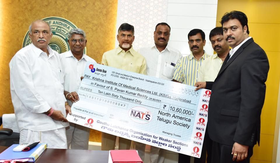 North America Telugu Society once again showed its commitment towards social service by donating Rs.10,60,000 to the family of Pawan Kumar, who was injured grievously in an accident in Madison in February and is undergoing treatment in KIMS. NATS President Mohan krishna Mannava met AP Chief Minister N.Chandrababu Naidu in Vijayawada on Sunday and the CM handed over the cheque to victim's family members. CM also appreciated the services of NATS.
