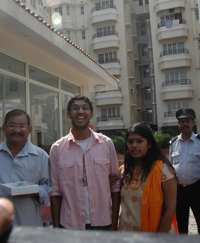 The runaway couple Shirish and Srija who have returned home after their stay in Delhi take time to strike a pose for the media at Krish Garden, Begumpet in Hyderabad.