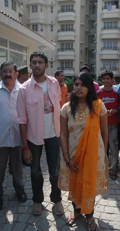 The runaway couple Shirish and Srija who have returned home after their stay in Delhi take time to strike a pose for the media at their Krish Gardens residence, Begumpet, Hyderabad.