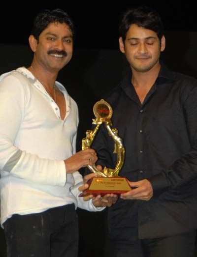 Mahesh Babu, the heart throb of the young, attended an annual awards ceremony of a telugu film magazine SANTOSHAM held at Sharjha (UAE) on last Friday. Mahesh Babu has been adjudged as the Best Actor for his outstanding performance in the run away hit of the year POKIRI. Jagapati Babu presented this award to Mahesh Babu. Mahesh Babu, who normally avoids attending film related functions has arrived with his wife Namrata and has been there till curtains were drawn. GEMINI-SANTOSHAM awards ceremony has been the first telugu film awards ceremony held outside the country. Though, very few stars graced this function more than 25 thousand enthusiastic telugu film lovers attended and cheered all the way.
