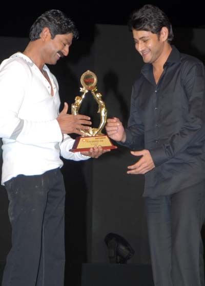 Mahesh Babu, the heart throb of the young, attended an annual awards ceremony of a telugu film magazine SANTOSHAM held at Sharjha (UAE) on last Friday. Mahesh Babu has been adjudged as the Best Actor for his outstanding performance in the run away hit of the year POKIRI. Jagapati Babu presented this award to Mahesh Babu. Mahesh Babu, who normally avoids attending film related functions has arrived with his wife Namrata and has been there till curtains were drawn. GEMINI-SANTOSHAM awards ceremony has been the first telugu film awards ceremony held outside the country. Though, very few stars graced this function more than 25 thousand enthusiastic telugu film lovers attended and cheered all the way.