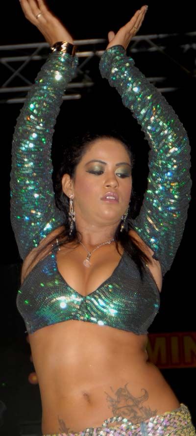 Mumaith Khan enthralled the audience at a live show held in connection with annual awards ceremony of a telugu film magazine SANTOSHAM held at Sharjha (UAE) on last Friday. GEMINI-SANTOSHAM awards ceremony has been the first telugu film awards ceremony held outside the country. Though, very few stars graced this function more than 25 thousand enthusiastic telugu film lovers attended and cheered all the way.