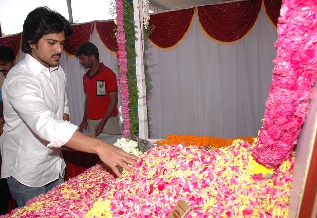 The 10th day ceremony of Chiranjeevi's father Venkata Rao was held at Cyber Gardens near Hitech City in Hyderabad on Thursday. Chiranjeevi's family paid floral tributes to their beloved man. Eminent people from film industry to politics attended the memorial and joined Chiranjeevi's family in paying tributes to the departed soul. The much talked about Central Minister Dasari Narayana Rao's presence aroused some curious moments among the visitors. Chiranjeevi personally accompanied Dasari to the portrait of his late father. Among other noted personalities who attended the ceremony were Akkineni Nageswara Rao, D.Rama Naidu, K. Raghavendra Rao, MS Reddy, Gaddar, Nagarjuna and key persons of Chiru, Pavan's fans associations. Later, Chiranjeevi's family thanked one and all for sharing their feelings by making a personal visit in the moments of their grief caused by the sudden demise of family doyen Venkata Rao.