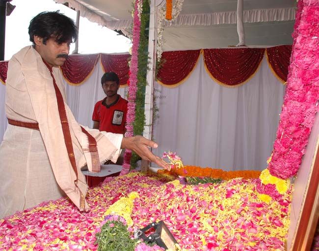The 10th day ceremony of Chiranjeevi's father Venkata Rao was held at Cyber Gardens near Hitech City in Hyderabad on Thursday. Chiranjeevi's family paid floral tributes to their beloved man. Eminent people from film industry to politics attended the memorial and joined Chiranjeevi's family in paying tributes to the departed soul. The much talked about Central Minister Dasari Narayana Rao's presence aroused some curious moments among the visitors. Chiranjeevi personally accompanied Dasari to the portrait of his late father. Among other noted personalities who attended the ceremony were Akkineni Nageswara Rao, D.Rama Naidu, K. Raghavendra Rao, MS Reddy, Gaddar, Nagarjuna and key persons of Chiru, Pavan's fans associations. Later, Chiranjeevi's family thanked one and all for sharing their feelings by making a personal visit in the moments of their grief caused by the sudden demise of family doyen Venkata Rao.