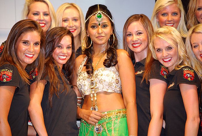 IN FULL SWING : Singer Smitha performing along with cheergirls before ther start of the IPL T20 match on Sunday.
