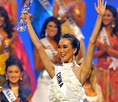 Miss China Ningning Zhang waves after receiving Miss Congeniality award at the Miss Universe 2007 pageant at the National Auditorium in Mexico City on May 28, 2007.