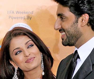 Bollywood star Aishwarya Rai listens to husband Abhishek Bachchan give an interview at the IIFA awards at the Hallam FM Arena in Sheffield, England.