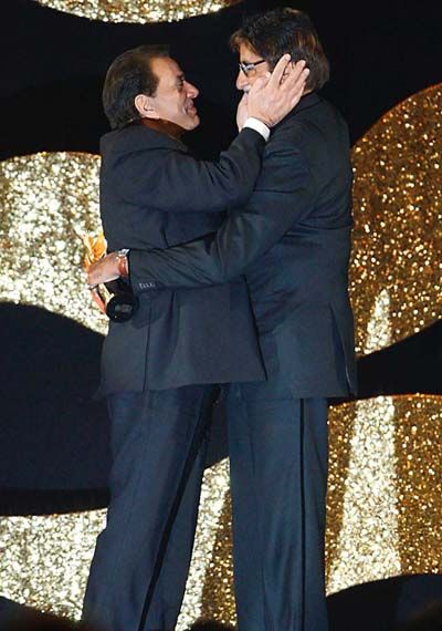 Bollywood veteran Dharmendra (L) and actor Amitabh Bachchan embrace on stage during the Indian International Academy Awards (IIFA) in Sheffield, northern England June 9, 2007.