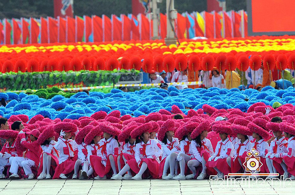 Chinese children dressed in costumes wait on Tiananmen Square for the National Day parade to start in Beijing on October 1, 2009.