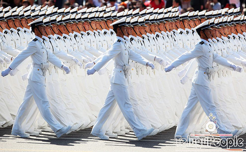 PLA sailors in white uniforms march past Tiananmen Square during the celebration of China's 60th anniversary on October 1, 2009 in Beijing, China.