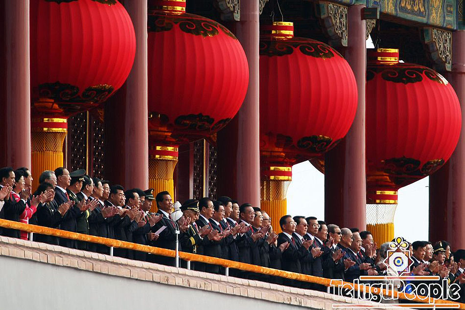 China's President Hu Jintao (center) and other leaders review a parade to mark China's 60th anniversary on October 1, 2009 in Beijing, China.