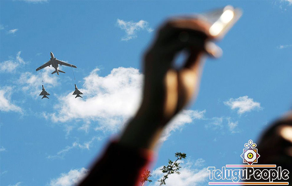 A man takes pictures of PLA aircraft performing a fly-over during the National Day parade in Beijing on October 1, 2009.