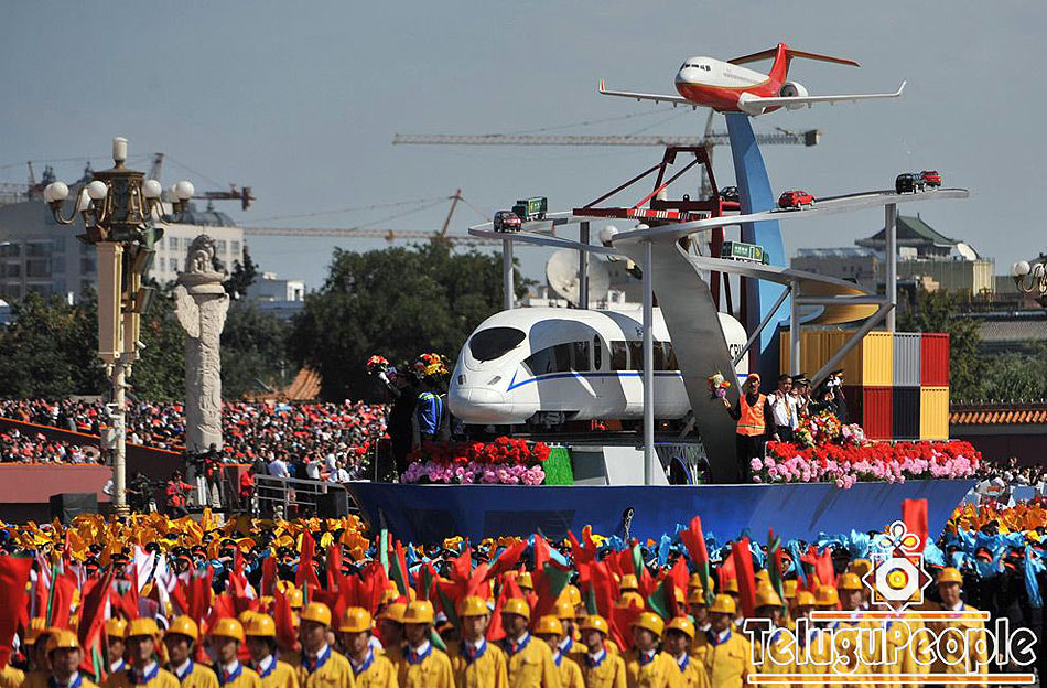 A float representing modes of transport passes by Tiananmen Square during the National Day parade in Beijing on October 1, 2009.