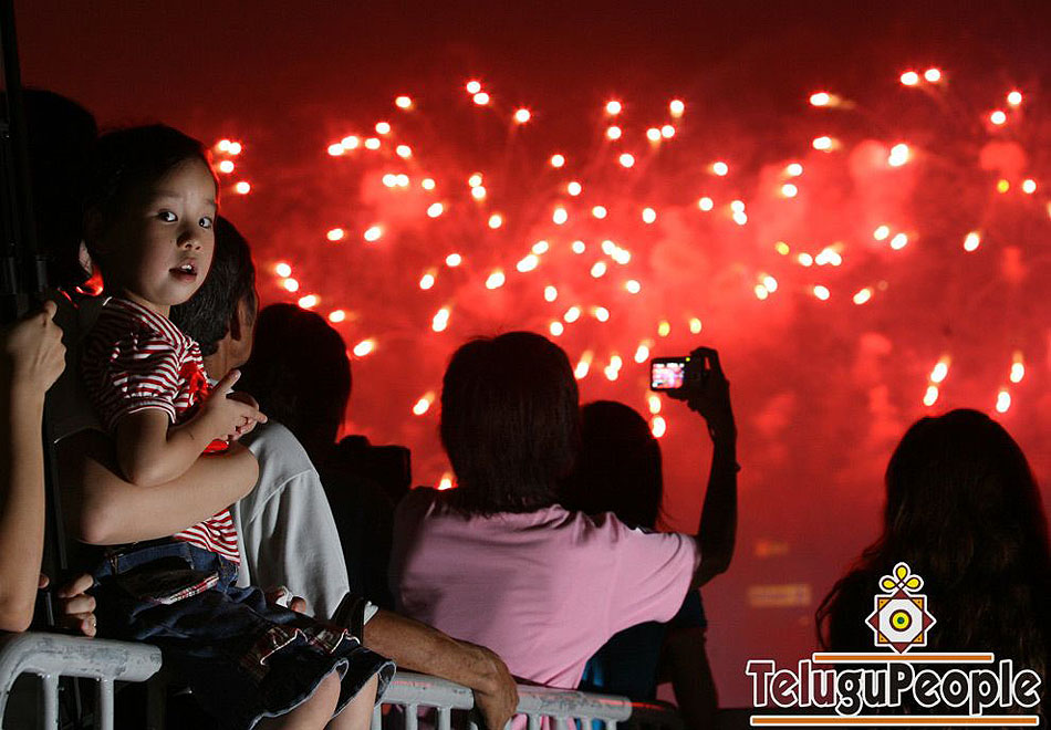A child watches as fireworks light up Victoria Harbour to celebrate Chinese National Day in Hong kong on October 1, 2009.