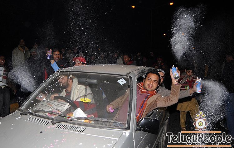 Pakistani youth celebrate New Year's Eve in Lahore, spraying artificial snow in the air on December 31, 2009. (Arif Ali/AFP/Getty Images) #